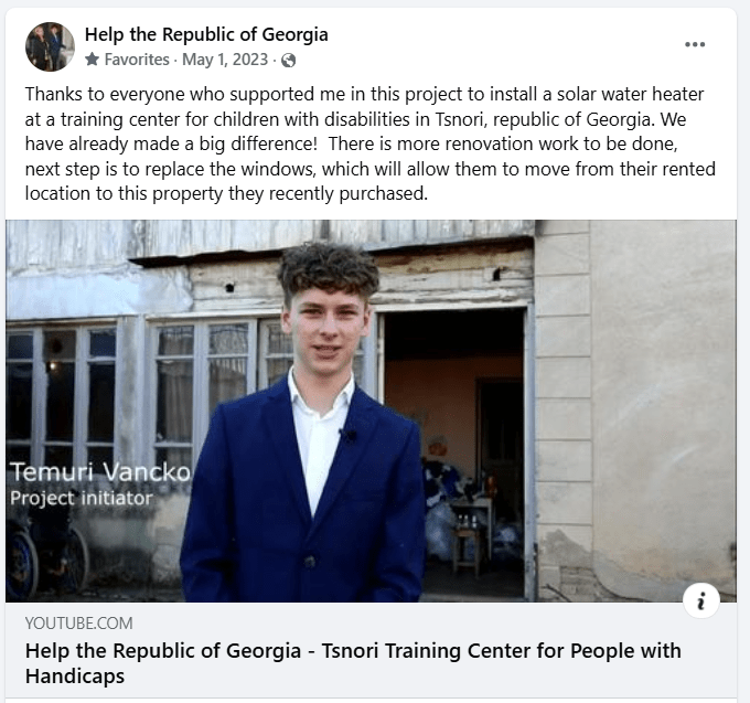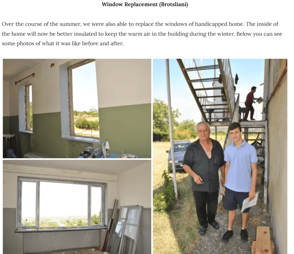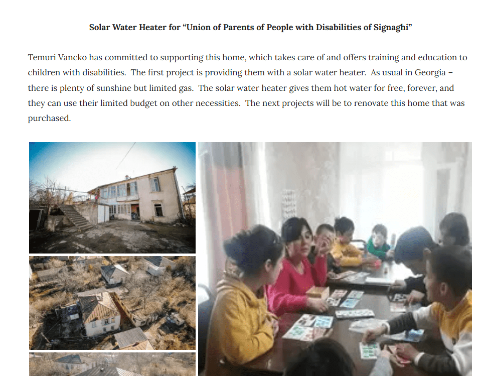 The project to install a solar water heater at the Training Center for Children with Disabilities in Tsnori was completed. Further, funds were raised and disbursed to renovate a property purchased by the Association of Parents with Disabled Children. A detailed overview of the projects are presented on the facebook page https://www.facebook.com/helprepublicofgeorgia and on the charity youtube channel Help the Republic of Georgia (@helptherepublicofgeorgia2049) https://www.youtube.com/watch?v=tB8RY9OFFFY